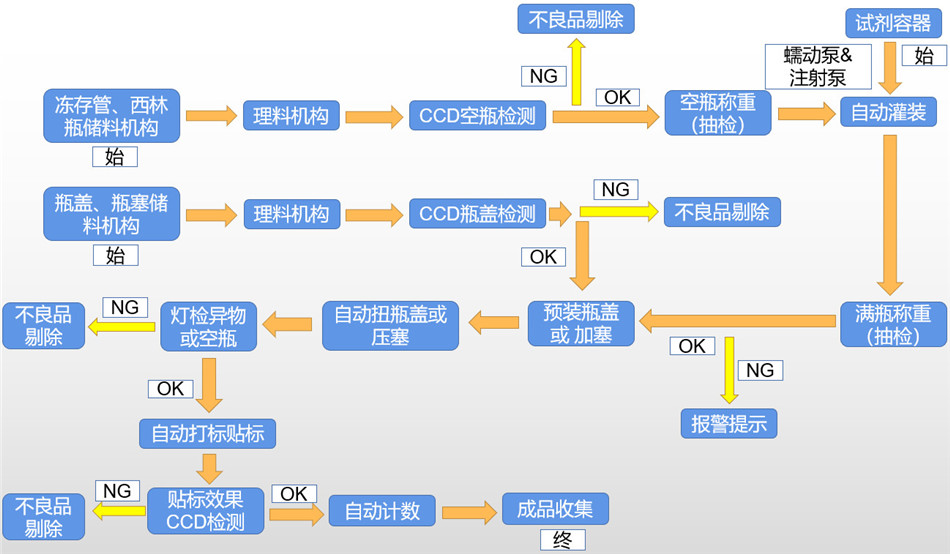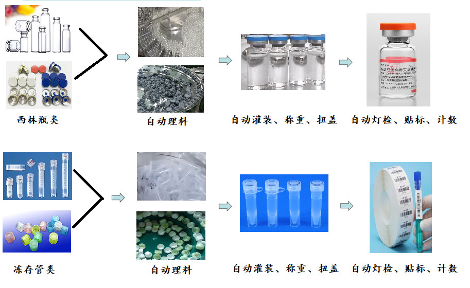 本產(chǎn)線可實(shí)現(xiàn)凍存管&西林瓶自動儲料—>自動理料供料—>CCD檢測瓶口—>自動空瓶稱重—>自動灌裝—>自動稱重—>自動供瓶蓋&膠塞—>瓶蓋良好性CCD檢測—>自動擰瓶蓋&加塞—>自動燈檢異物及空瓶—>CCD檢測擰蓋效果—>自動打標(biāo)貼標(biāo)—>貼標(biāo)效果CCD檢測—>自動出料收集或碼盤(托盤緩存及出料)等一系列動作,使該類產(chǎn)品的生產(chǎn)灌裝貼標(biāo)工序?qū)崿F(xiàn)完全自動化,提升產(chǎn)能及品質(zhì),節(jié)省人工。